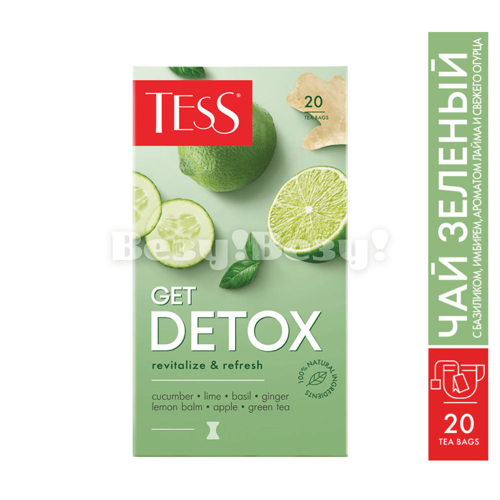 Чай зелёный байховый Tess Get Detox с добавлением чая оолонг байхового; с ароматом лайма и свежего огурца; пакетированный; Изготовитель: ТОО"Орими"; Россия.