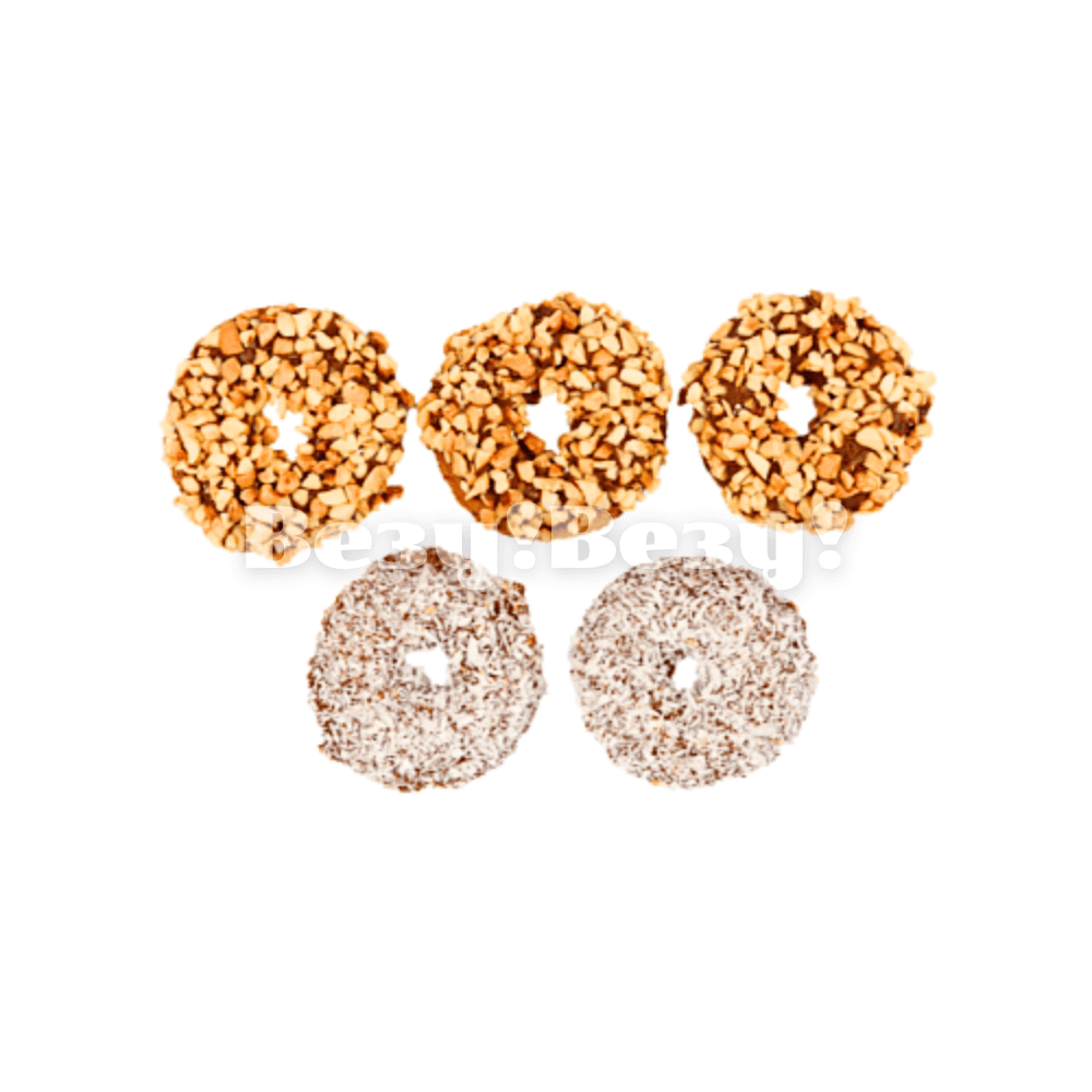 Нежное песочное кольцо, украшенное чёрным шоколадом, кокосовой стружкой и орехом (арахис).