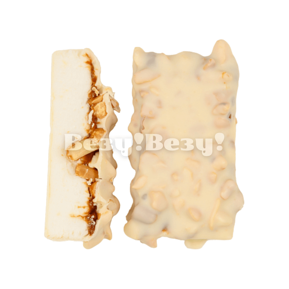 Каждое печенье щедро посыпано дроблёным жареным арахисом и покрыто гладкой белой шоколадной глазурью, что создает идеальное сочетание сладости и хрустящей текстуры.