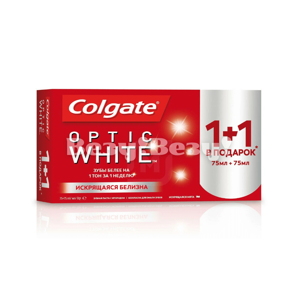 Зубная паста Colgate Optic White 75 мл 1+1 — отбеливающая паста с эффектом сияющей улыбки. Удаляет потемнения от кофе, чая и других красителей, восстанавливая естественную белизну зубов. В комплекте две тубы по 75 мл.