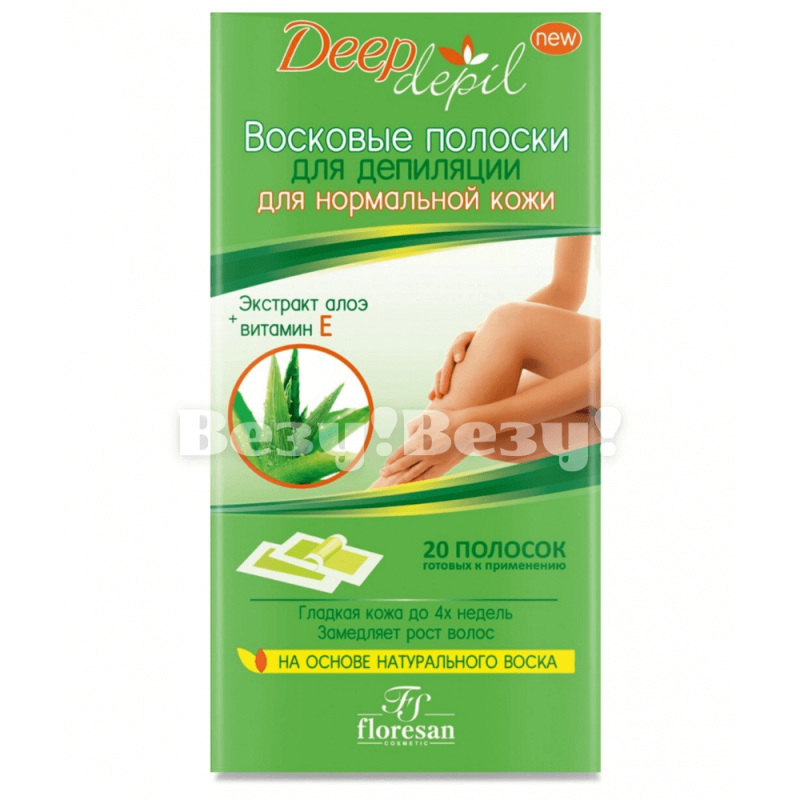 Восковые полоски Deep Depil для депиляции; для нормальной кожи; 20 полосок с Алоэ Вера;изготовитель: ООО"Флорель"; Россия. Восковые полоски с Алоэ вера идеально подходят для быстрого и эффективного удаления нежелательных волосков на лице. Они просты в использовании и сделают Вашу кожу гладкой и шелковистой надолго. Благодаря воску Стрейч-эластик, который идеально повторяет форму тела и учитывает все детали рельефа кожи, стало возможным удалять волосы разной длины, включая самые короткие.