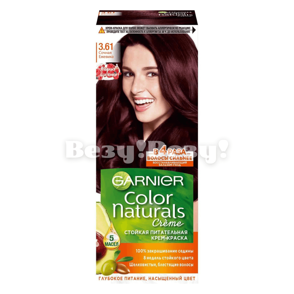 Стойкая питательная крем-краска Color Naturals Сочная ежевика с маслами придает волосам выразительный цвет, покрывает 100% седины. Масла оливы, авокадо, ши, клюквы и арганы в формуле насыщают структуру волос питательными компонентами, доставляют краситель глубоко в сердцевину волоса и создают защитное покрытие от вымывания пигмента. Оттенок сохраняет свою яркость до 8 недель, а локоны выглядят мягкими, струящимися и сияющими. Ухаживающий бальзам с маслами после окрашивания оказывает восстанавливающее и укрепляющее действие: увлажняет, защищает от сухости, повышает силу волос в 4 раза. Оттенок 3.61 «Сочная ежевика» Garnier Color Naturals – глубокий темно-каштановый цвет с холодным фиолетовым подтоном.