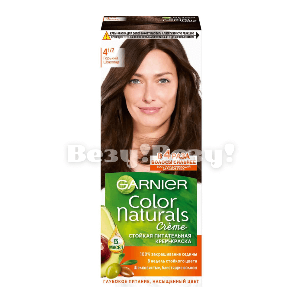 Крем-краска, сочетающая в себе окрашивание и питательный уход благодаря формуле с 5 маслами: оливы, авокадо, ши, клюквы и арганы. Ее обволакивающая текстура не течет, равномерно распределяется, помогает красящим пигментам и полезным веществам проникать глубже в волокна волос и обеспечивать локонам интенсивный стойкий цвет, 100% покрытие седины, мягкость и шелковистость. Оттенок остается ярким до 8 недель. Бальзам-уход помогает восстановить волосы после окрашивания: увлажняет, укрепляет и смягчает локоны. Ваши локоны мягкие на ощупь и 4 раза более сильные, сияют здоровьем. Оттенок 4 1/2 «Горький шоколад» Garnier Color Naturals – глубокий натуральный оттенок с холодным подтоном.