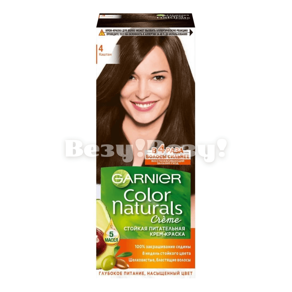 крем-краска Garnier Color Naturals 4 «Каштан» не просто покрывает волосы, а проникает в кутикулы, активно увлажняя и питая их. Многочисленные масла, богатые жирными кислотами и витаминами, в составе формулы обеспечивают эффективный комплексный уход: укрепление, защиту от внешних воздействий, предотвращение сечения волос и возвращение им блеска. Оттенок 4 «Каштан» отлично справляется с задачей закрашивания седины и сохраняется на волосах до 8 недель*, не теряя насыщенности.