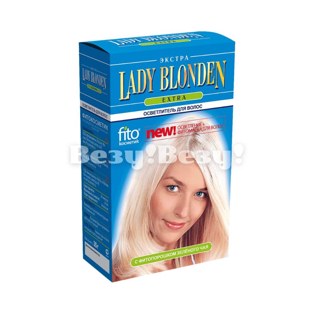 Осветлитель для волос Lady Blonden Extra; Содержимое упаковки: 1 пакет с осветляющей пудрой 20гр; 1 пакет с гидроперитом 15гр; 1 инструкция по примениению; 1 пара перчаток; Производитель:ООО "Фитокосметик"; Россия.