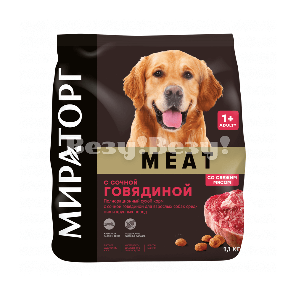 Полнорационный сухой корм для взрослых собак средних и крупных пород MEAT с сочной говядиной 1,1 кг