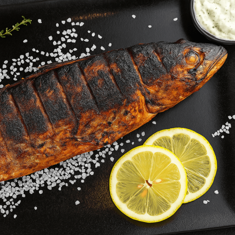 Скумбрия BBQ — сочная рыба, приготовленная на гриле до золотистой корочки, с ярким ароматом дыма и насыщенным вкусом. Отлично подходит для ужина или пикника.