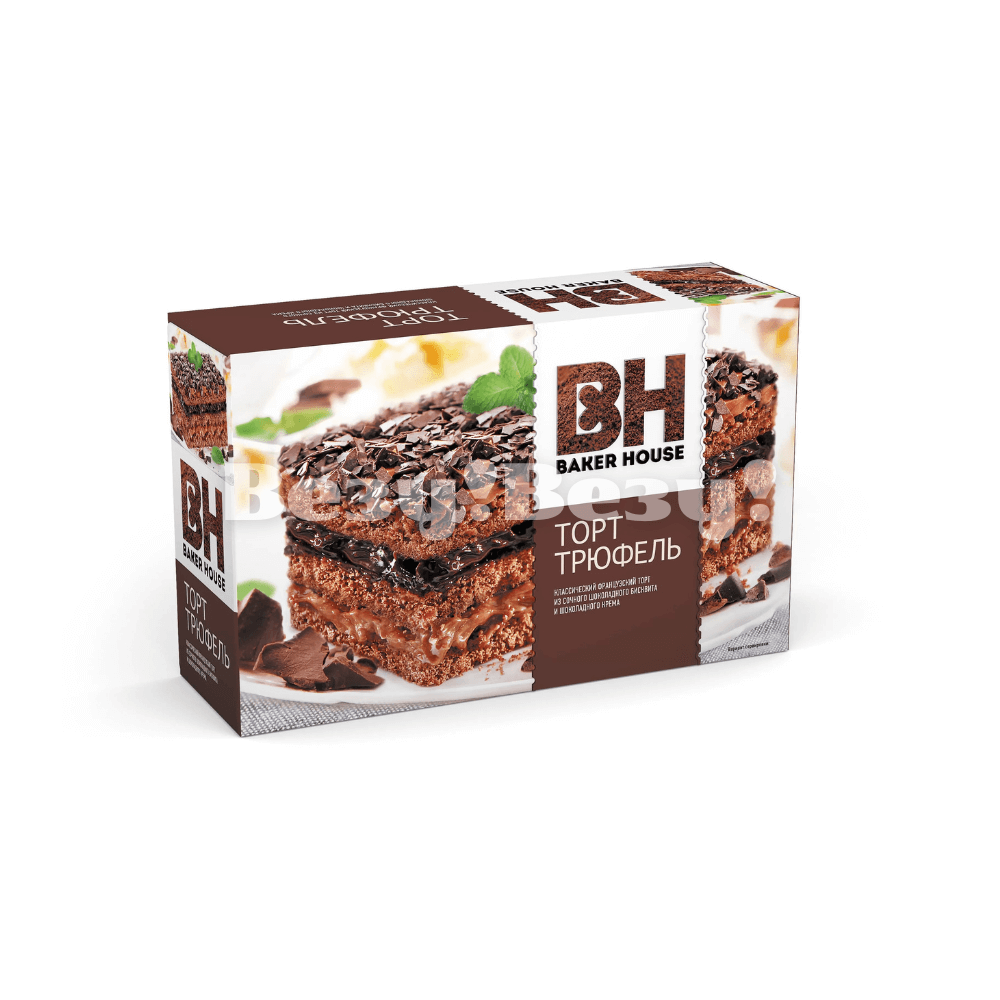 Baker House Трюфель – изысканный торт весом 350 г с насыщенным шоколадным бисквитом и нежным кремом из настоящего шоколада. Идеален для особых случаев и уютных чаепитий.