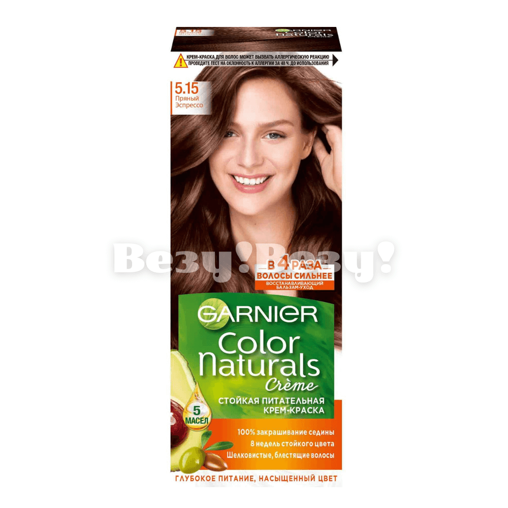 Крем-краска Garnier Color Naturals Пряный Эспрессо с густой обволакивающей текстурой на маслах обеспечивает комфортное окрашивание и интенсивный питательный уход. Краска легко распределяется по прядям и не течет, а благодаря комплексу из 5 масел: оливы, авокадо, ши, клюквы и арганы, насыщает волосы питательными компонентами, повышая их гладкость и эластичность. Вместе с полезными веществами глубоко в структуру проникают красящие пигменты, за счет чего оттенок получается интенсивным и стойким до 8 недель, без следов седины. Ухаживающий бальзам с 5 маслами восстанавливает волосы, делая их в 4 раза более сильными, шелковистыми и сияющими. Оттенок 5.15 «Пряный Эспрессо» Garnier Color Naturals – теплый светло-каштановый оттенок.