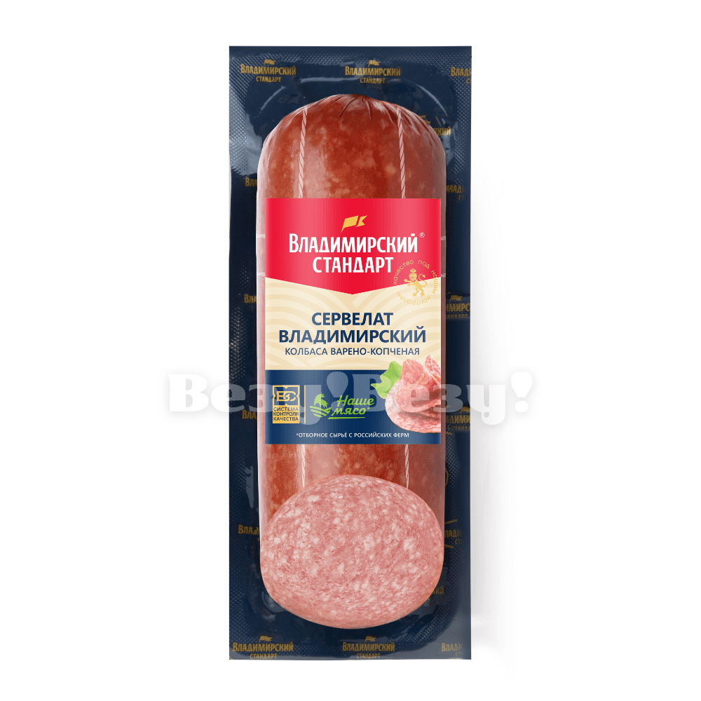 Сервелат "Владимирский" - имеет мелкозернистую структуру. Производится из трех видов мяса с добавлением ароматных специй и натурального копчения на буковой щепе. Уникальное сочетание вкусо-ароматических характеристик, оптимальное соотношение цены и качества- все это делает его безусловным лидером продаж в своем сегменте. Производится по ТУ- уникальная разработка технологов Владимирского стандарта. Используется только охлажденное сырье.