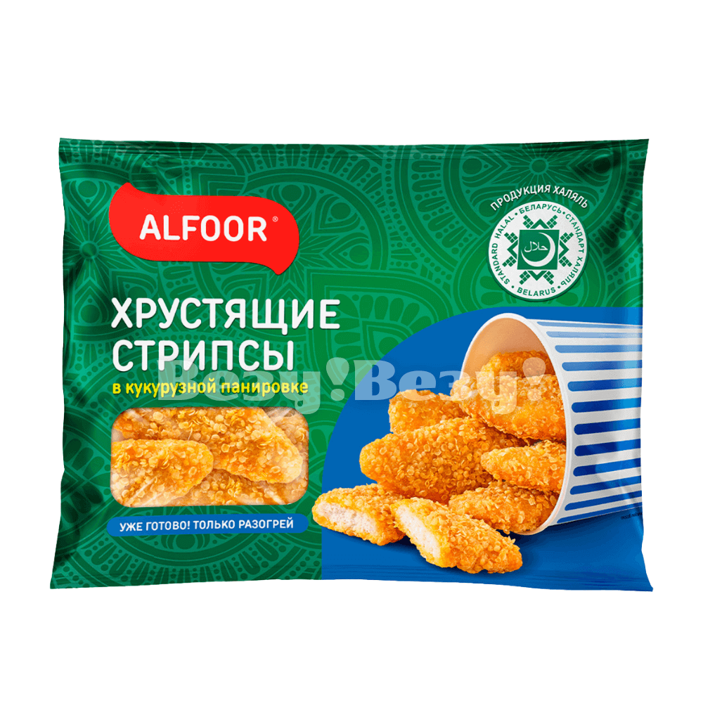 Стрипсы Хрустящие Alfoor - это замороженное блюдо, представляющее собой хрустящие полоски мяса.